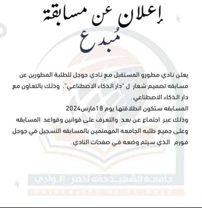 اسماء الطلبة المدعوين المشاركين في تصميم احسن شعار لدار الذكاء الاصطناعي. سيكون الاعلان عن الثلاثة الفائزين الاوائل يوم 30 افريل بقاعة المحاضرات الكبرى. بالتوفيق للجميع